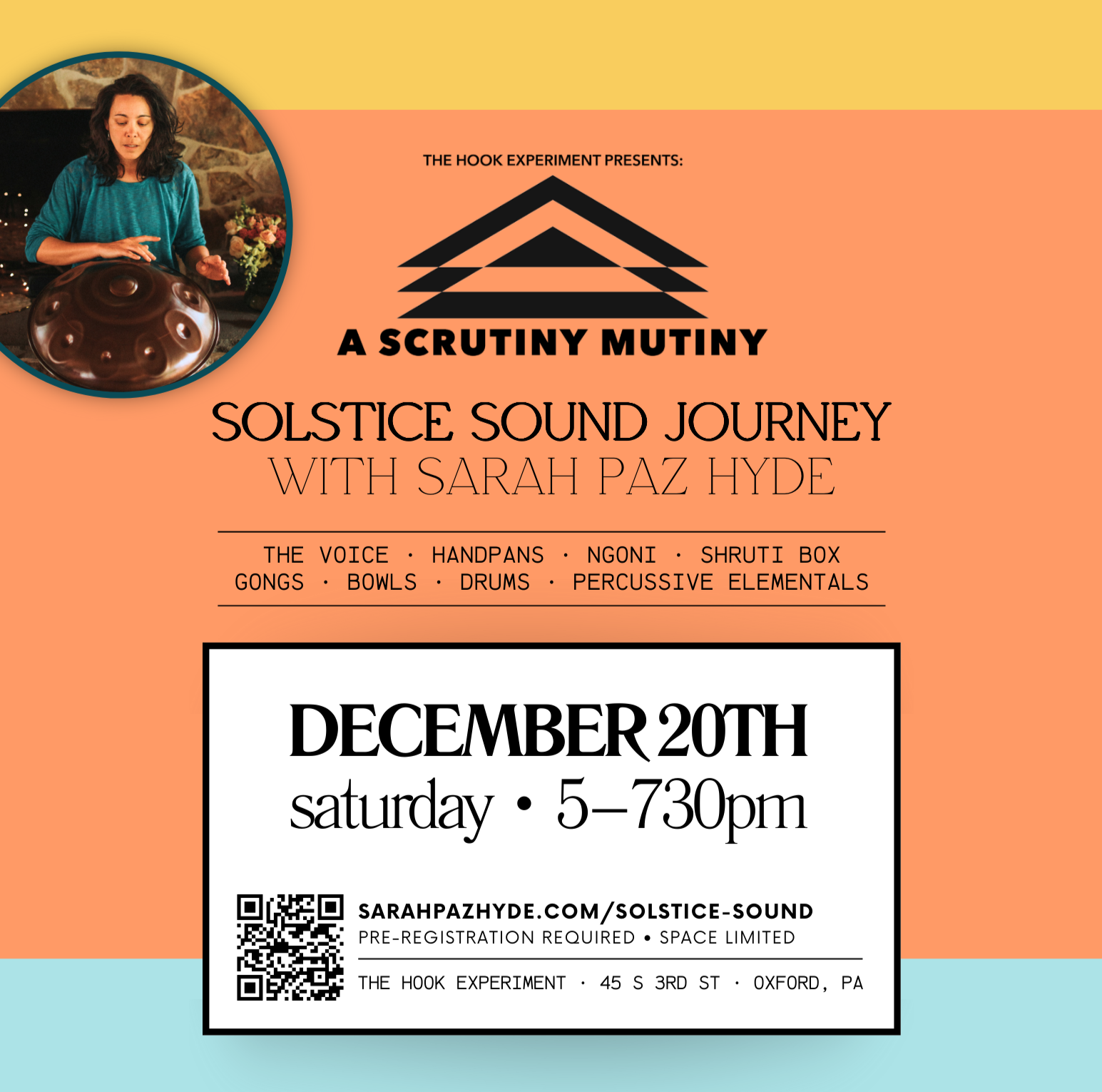 Guided by a blend of sounds, we will weave solstice themes with currents present in the Scrutiny Mutiny exhibit that holds us. The evening’s meditation moves between stillness, silence & sound, and invites us to dance with the density of discernment that relates to the softness needed when cycling through the inner landscapes of the soul.